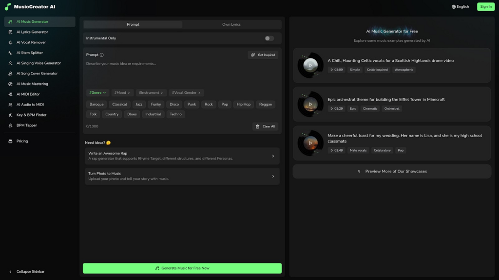 MusicCreator AI is packed with features that make creating music simple and fun for everyone, including those exploring photo-to-music options. Whether you’re just starting out or you’ve already made some music, this tool helps you get creative without any hassle. Let’s look at the main ways it stands out and helps you turn ideas into music in seconds.
